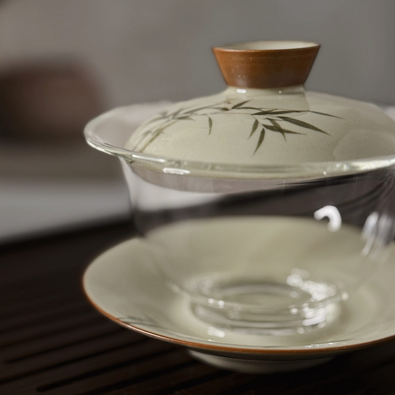 Гайвань «Смарагдовий Бамбук» поєднує кришталево чисте скло та тонкий фарфор із ручним розписом. Мотиви зеленого бамбука — символу витримки, мудрості та рівноваги — надають виробу особливу атмосферу спокою та вишуканості.