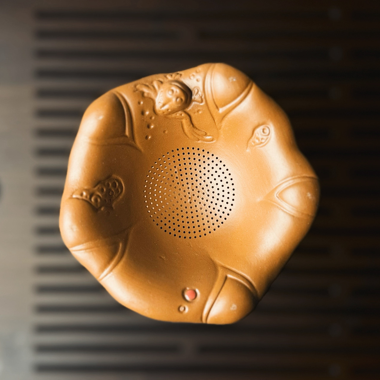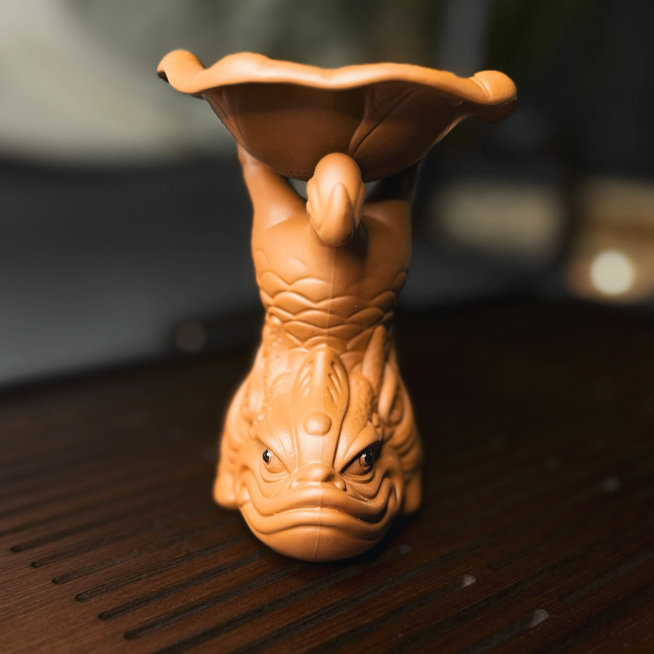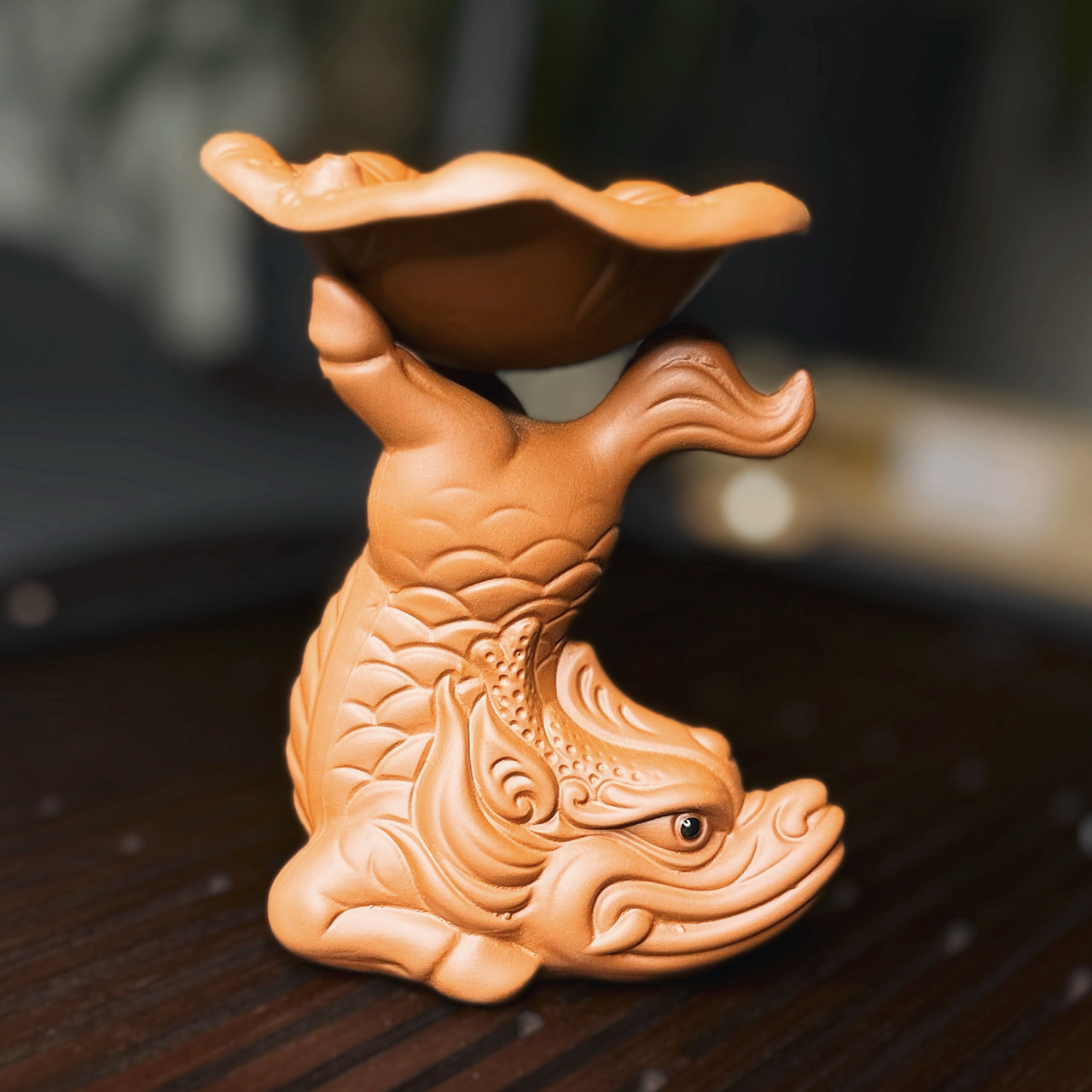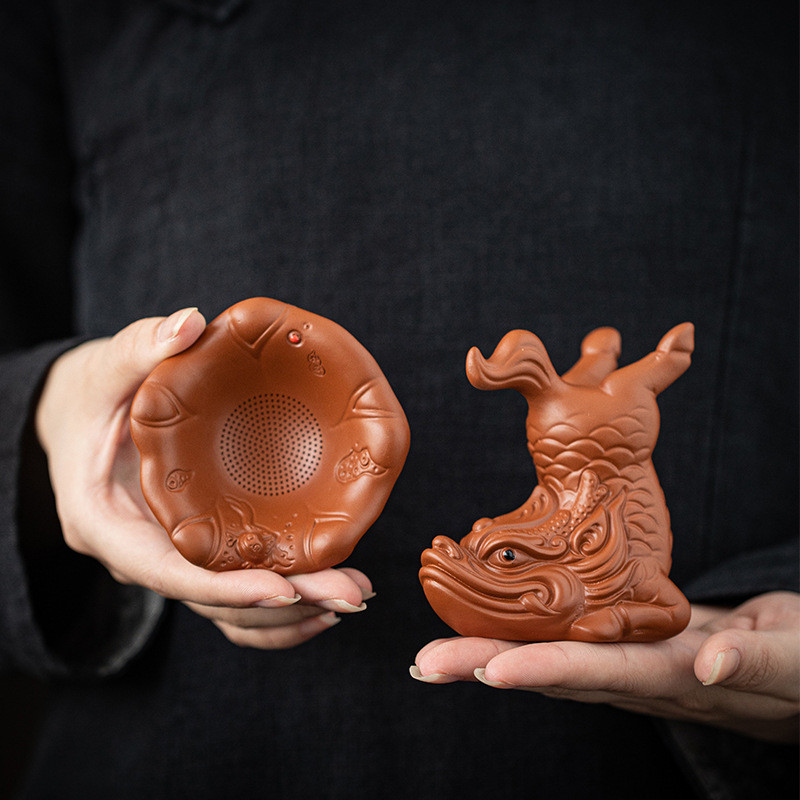 Авторське ситечко з кераміки у вигляді міфічної риби-дракона — символу удачі та зростання. Верхня «чаша-пелюстка» приймає потік і делікатно відсіює лист, тож настій виходить чистим, аромат розкривається рівномірно. Конструкція стійка і зручна у щоденному використанні — ситечко впевнено стає на стіл і пасує до більшості склянок та піал.