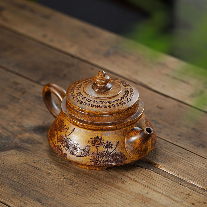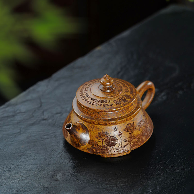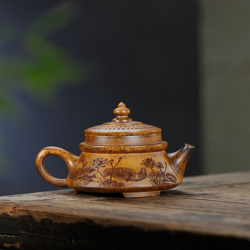 «Лотос у Тиші» — це витончений ісинський чайник об’ємом 250 мл, прикрашений делікатним різьбленням лотосів. У китайській культурі лотос означає чистоту, гармонію та спокій розуму. Теплі піщано-бурштинові відтінки глини, природна текстура та плавні кольорові переходи створюють атмосферу затишку і традиційності. Ідеальний вибір для особистих медитативних чаювань та неспішних проливів.