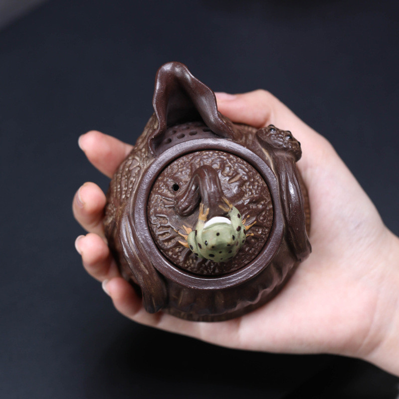 Читати повністюЧайник виготовлений із якісної ісинської глини цзи ні та декорований рельєфом листя лотоса. На кришці — фігурка жабки, що у чайній культурі символізує спокій, чистоту та оновлення. Кожна деталь продумана, фактура максимально природна та жива.