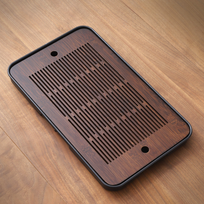 Розмір 46 × 23 × 4 см дозволяє зручно розмістити чайник, чашки та інші аксесуари. Верхня панель має поздовжні отвори для стікання води, а під нею — знімна ємність для збору рідини, яка підтримує чистоту та комфорт під час чаювання.